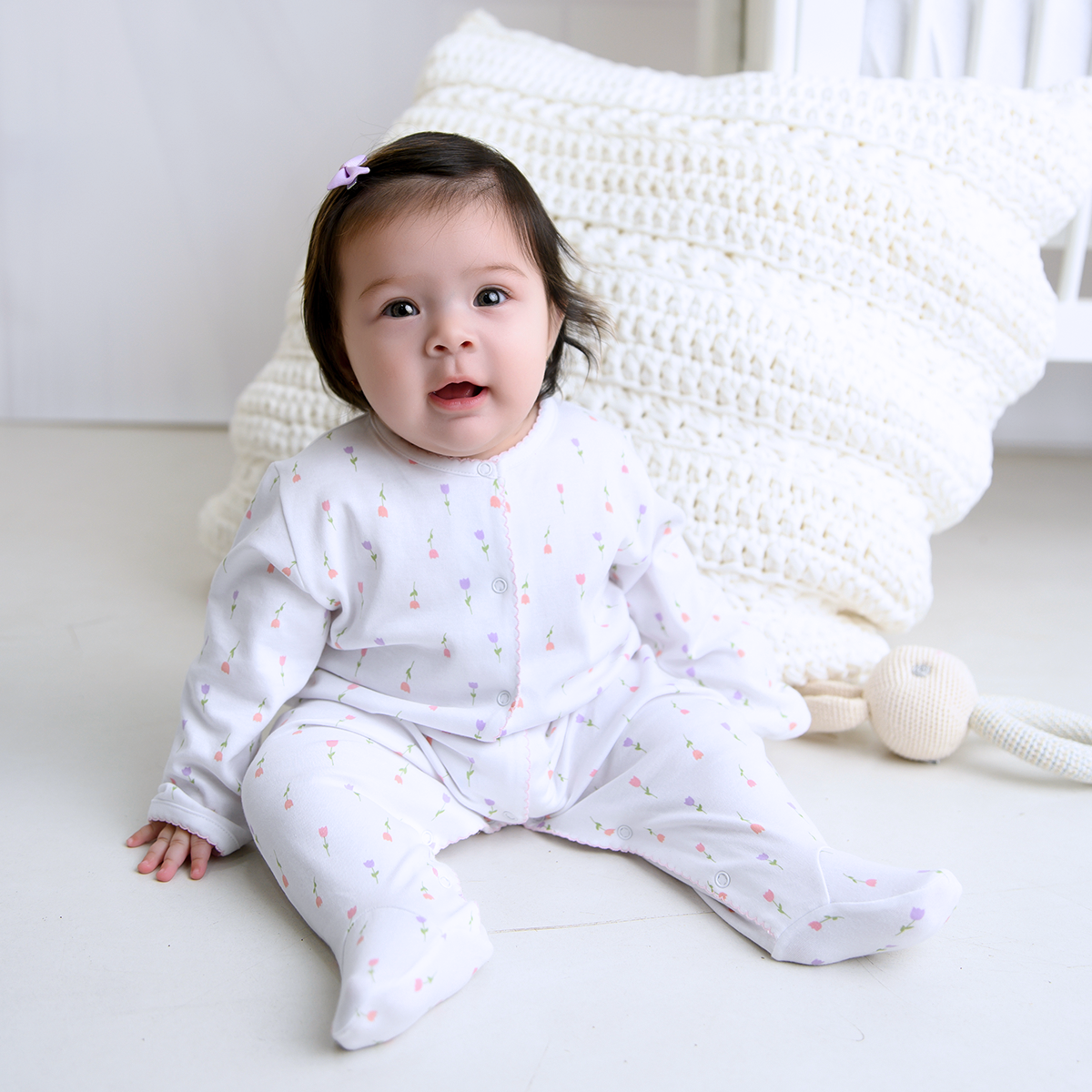 Soft and luxurious Peruvian Pima cotton footie with Bloom Tulips print. Charming pink trim. Ultra-soft, durable, and machine washable. Handmade by Peruvian artisans.
