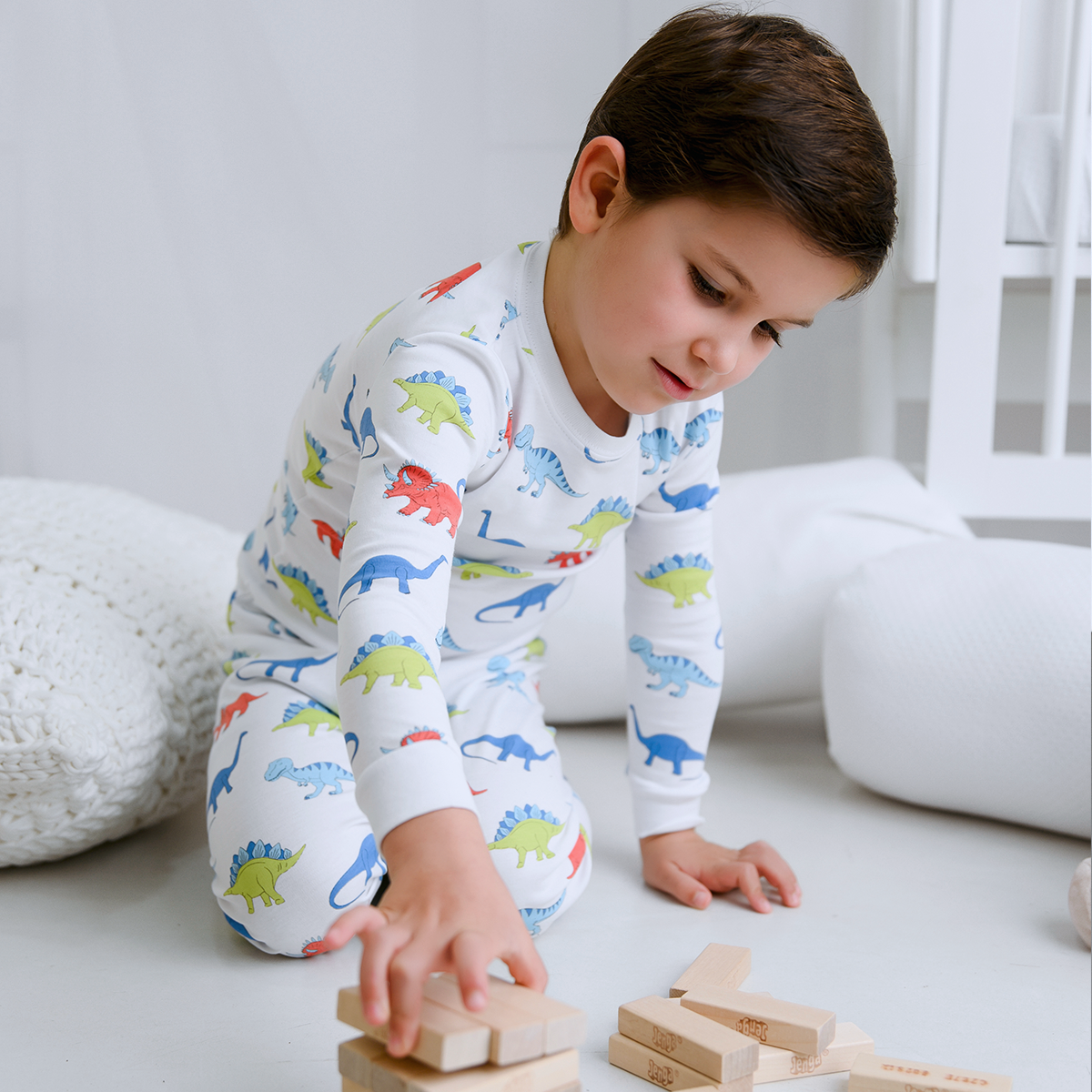Soft and luxurious Peruvian Pima cotton pijama with Colorful Dinos print. Ultra-soft, durable, and machine washable. Handmade by Peruvian artisans.