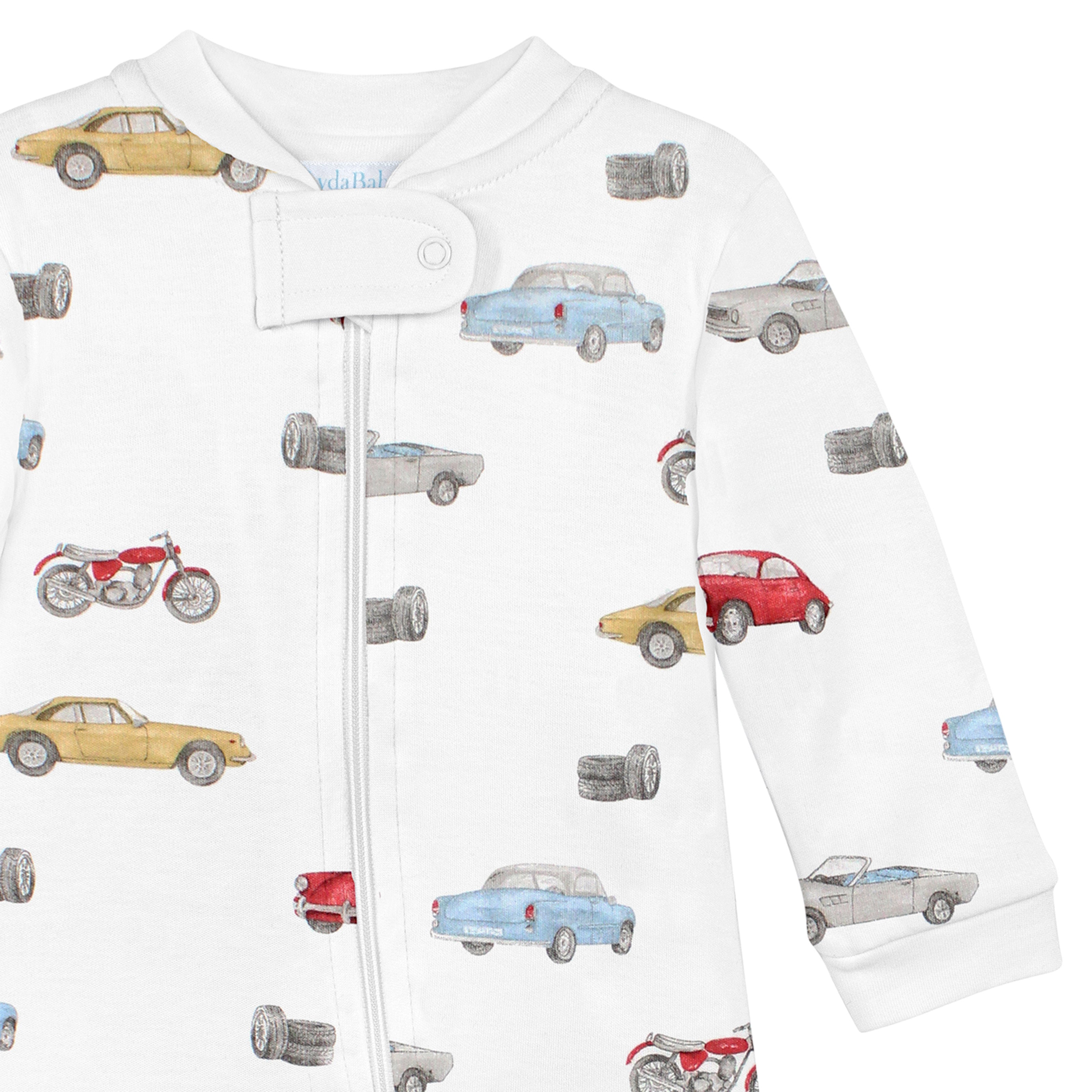 Soft and luxurious Peruvian Pima cotton footie with Motor Lover print. Ultra-soft, durable, and machine washable. Handmade by Peruvian artisans.