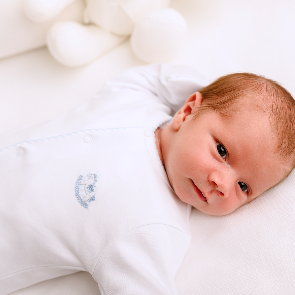 Soft and luxurious Peruvian Pima cotton footie with delicate hand embroidery of a New Born Toys and charming light blue trim. Ultra-soft, durable, and machine washable. Handmade by Peruvian artisans.